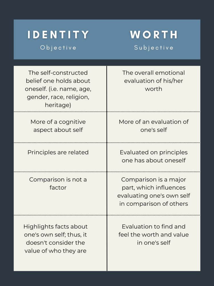 Let’s look closer and examine the characteristics of identity and worth parallel to one another.